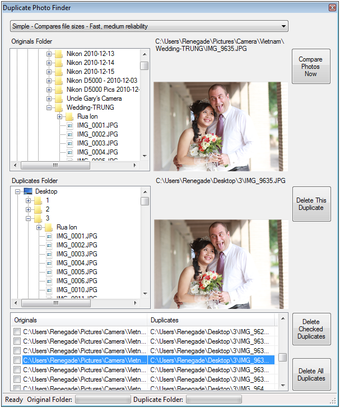 Duplicate Photo Finder is een lichte applicatie waarbij gebruikersgemak voorop staat. Het menu is zonneklaar: links selecteer je 2 mappen met foto's en rechts klik je op de 'Compare Photos Now'-knop om de zoektocht in gang te zetten. Je hebt de keuze uit een snelle zoektocht of een betrouwbaarder - maar tevens trager - vergelijkingsproces. Na het onderzoek presenteert Duplicate Photo Finder de dubbele exemplaren onderaan het menu. Deze verwijder je individueel of allemaal tegelijk.
